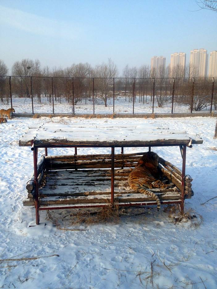 我不曾想到,哈尔滨的司机太黑心,以为我们背包客好欺负,漫天要价,嚣张拒载。收拾残破的心情,去东北虎林园与大喵们来一场亲密接触。我喜欢自然,尤其是对于猫科动物和犬科动物,一点抵抗力都没有。据说,东北虎林园有1200只东北虎,此言不虚。观光车缓缓前行,十数只大喵宛若保镖一般紧紧跟在我们车后。有几只分外调皮的,竟爬上围栏,炫耀着锋利的牙齿,卖弄着呆萌的表情。虎和猫一样,有时候就懒洋洋地想当一只美男子,有时候就一副爱理不理的傲娇蠢样。东北虎林园除了东北大喵外,还有几只非洲狮。我本以为他们会在冰天雪地中可怜地直哆嗦,没想到却是一脸幸福地吐着舌头,舔着爪子卖萌。如果有可能,我还想着和小虎崽逗逗玩耍,奈何天气太冷,没有这样的机会。日薄西山后的夜间正是东北虎出没的好时间,只是可惜,无缘可见。