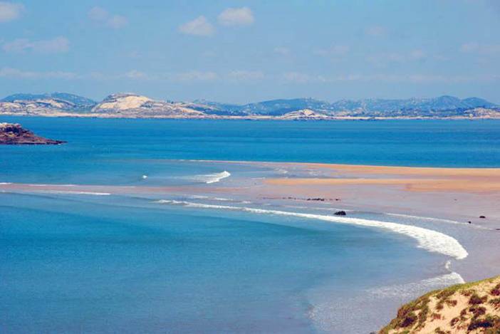 一座小山丘挡住了视线,隐隐约约感觉到山的那一面是另一片海。可惜,这次旅行只是穿了一双沙滩鞋,爬山有点捉襟见肘。不过,困难是阻挡不了旅行者对于梦想的追逐。一番周折后,果真如预料那般,一片毫无人际的海出现在眼前。可能是因为光线的原因,这一片海显得更蓝更美。更高的花岗岩上,黑羊咩咩,也许它们是在用自己的方式欢迎我们这群不速之客吧。此时此刻,一行人分成两队:一队翻过山头返程,一队下山走沙滩回营。回营的路上,偶见一群大鸭呷呷,蹒跚地行走在礁石间,沐浴着阳光。