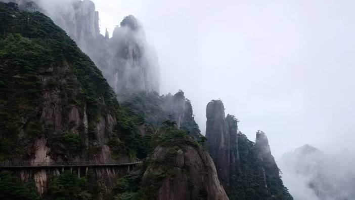 漫步在海拔1600多米的高空栈道上,一边是悬崖绝壁和原始森林,一边是幽深的峡谷,栈道宛如玉带缠缠绵绵的横挂在群山腰间,使得绝壁千刃变坦途,是十分的惬意,百分的休闲。一路之上栈道坡度没有太大的起伏变化,权当是闲庭信步。当日天气清朗舒适,阳光与云海与山岚雾气交替,更使得三清山变化万千,宛若天女列队由远至近向我们款款走来,且步履妖娆长袖善舞,那时而阳光、时而云雾弥漫恰如仙女们的水袖飘飘,让人不饮而醉,陶醉在大自然的奇幻仙境之中。