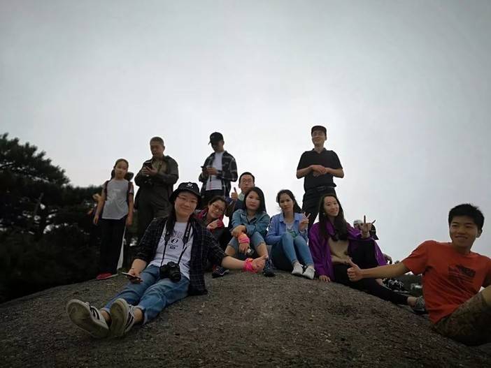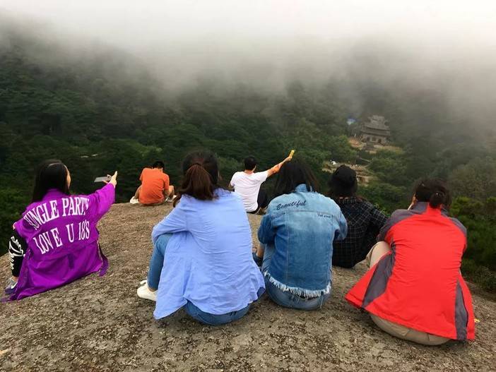 过了天门继续登山就是天门峰了,峰顶就是一块光秃秃的花岗岩石。站在峰顶可以俯瞰三清宫的全貌。天门峰的最高点叫做紫烟石,若要攀上石顶需要通过几个石阶,石阶又称之为“天梯”,寓意紫烟石可以与天地想通。紫烟石因位于三清宫的正东,名称由紫气东来衍化而来。紫烟石三面是沟谷深壑,无遮无拦,峰顶面积不大,状如半球,十几个人就坐满了,这里是东西海岸的交汇点,海拔一千五百米以上,是观日出赏日落的绝佳所在,身在峰巅需格外小心,稍有不慎就有坠崖的危险。可惜当日雾锁三清日落是看不到了,默默祈祷明日能够云开雾散让我们一睹日出云海的盛景。